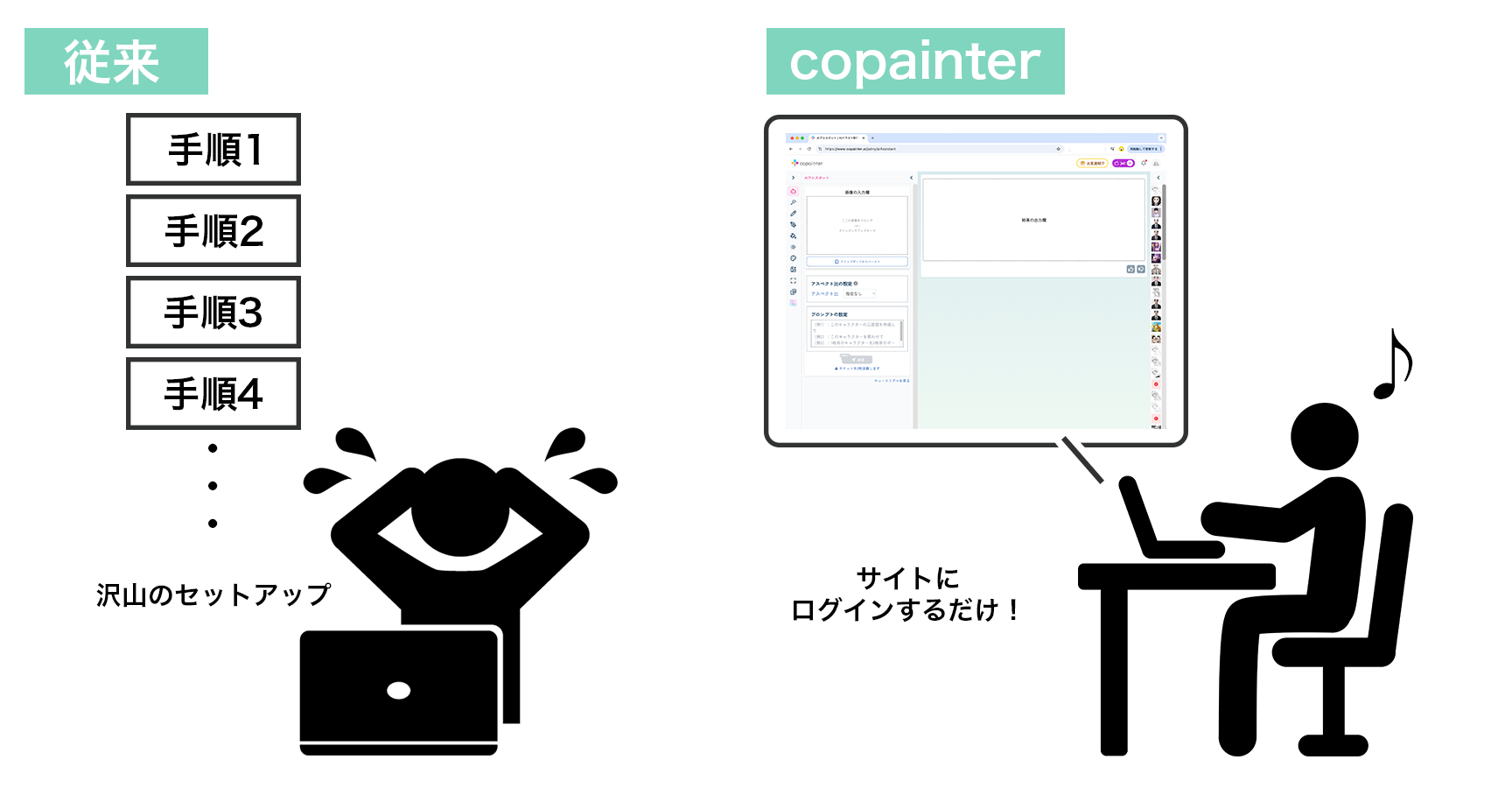ツールの利用には高性能なPCや複雑なソフトウェアは不要です。直感的なWEBインターフェースにより、AIツールの操作に不慣れな方でも簡単に使いこなせます。copainterは、クリエイターの可能性を広げ、作品制作を手軽にサポートする次世代の制作支援ツールです。
